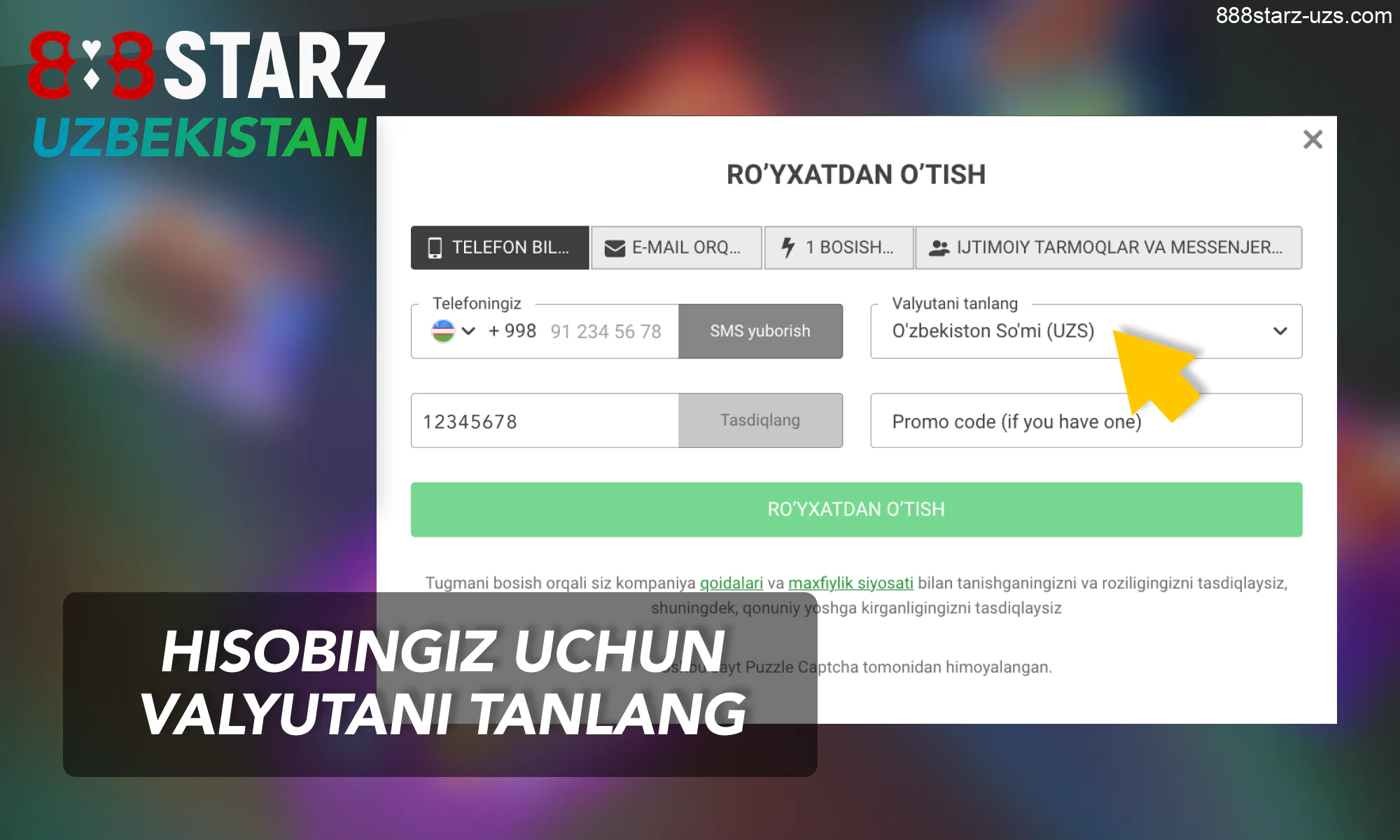 888Starz UZ da yangi hisob ochishdir. Roʻyxatdan oʻtish faqat hisob yaratish vaqtida kamida 18 yoshga toʻlgan oʻyinchilar uchun mavjud. Saytda roʻyxatdan oʻtish bir necha usullar bilan amalga oshiriladi – elektron pochta manzili, ijtimoiy tarmoqlar orqali, UZ telefon raqami orqali va bir marta bosish orqali. Keling, telefon raqami boʻyicha yangi hisob yaratish jarayonini batafsil koʻrib chiqaylik:
